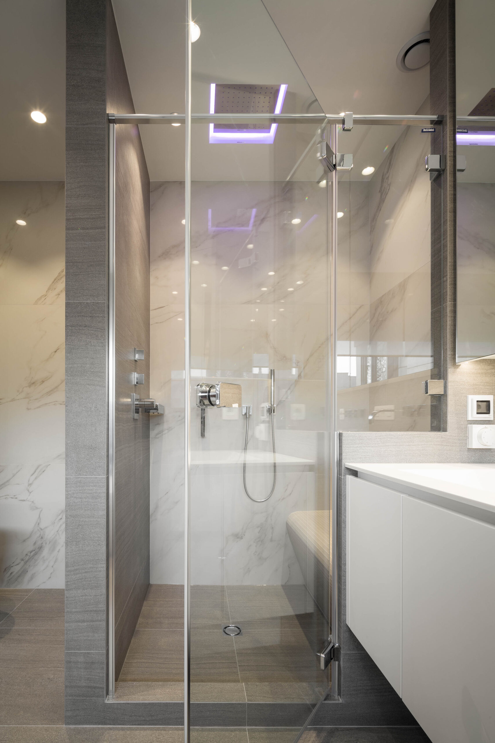 Le projet inclut également une étude d’éclairage soignée, des baffles intégrées avec contrôle via application sur GSM, ainsi qu’un WC japonais, apportant une touche de technologie et de confort à cette rénovation de salle de bain à Uccle.